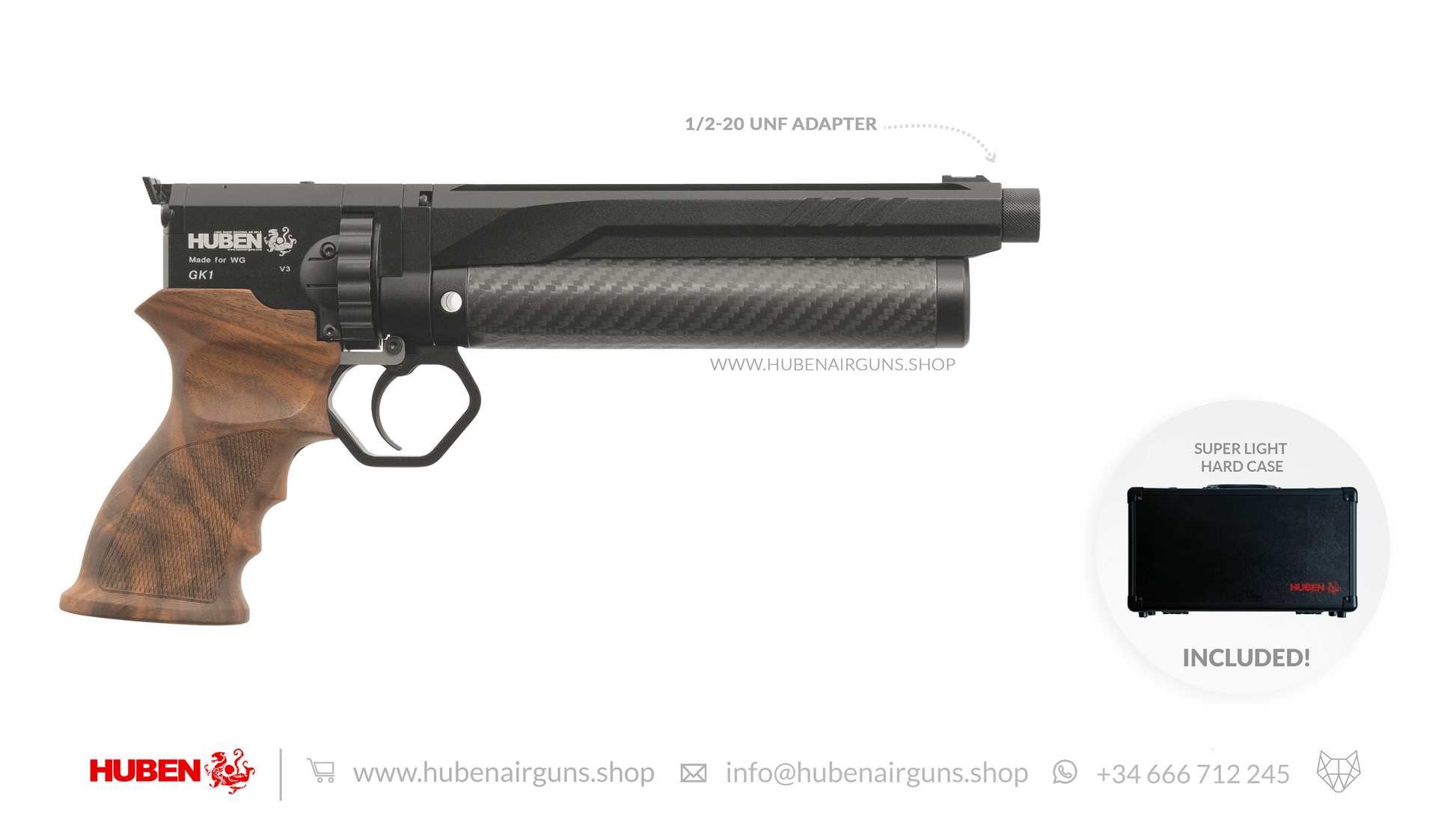 Ahora disponible en calibres .177, .22 y .25 y a un precio competitivo, la Huben GK1 es perfecta para usuarios que deben cumplir con restricciones de energía sin sacrificar el rendimiento. La pistola puede equiparse con un adaptador 1/2-20 UNF, lo que permite añadir un moderador para reducir el ruido y mejorar su practicidad en diversos entornos.
